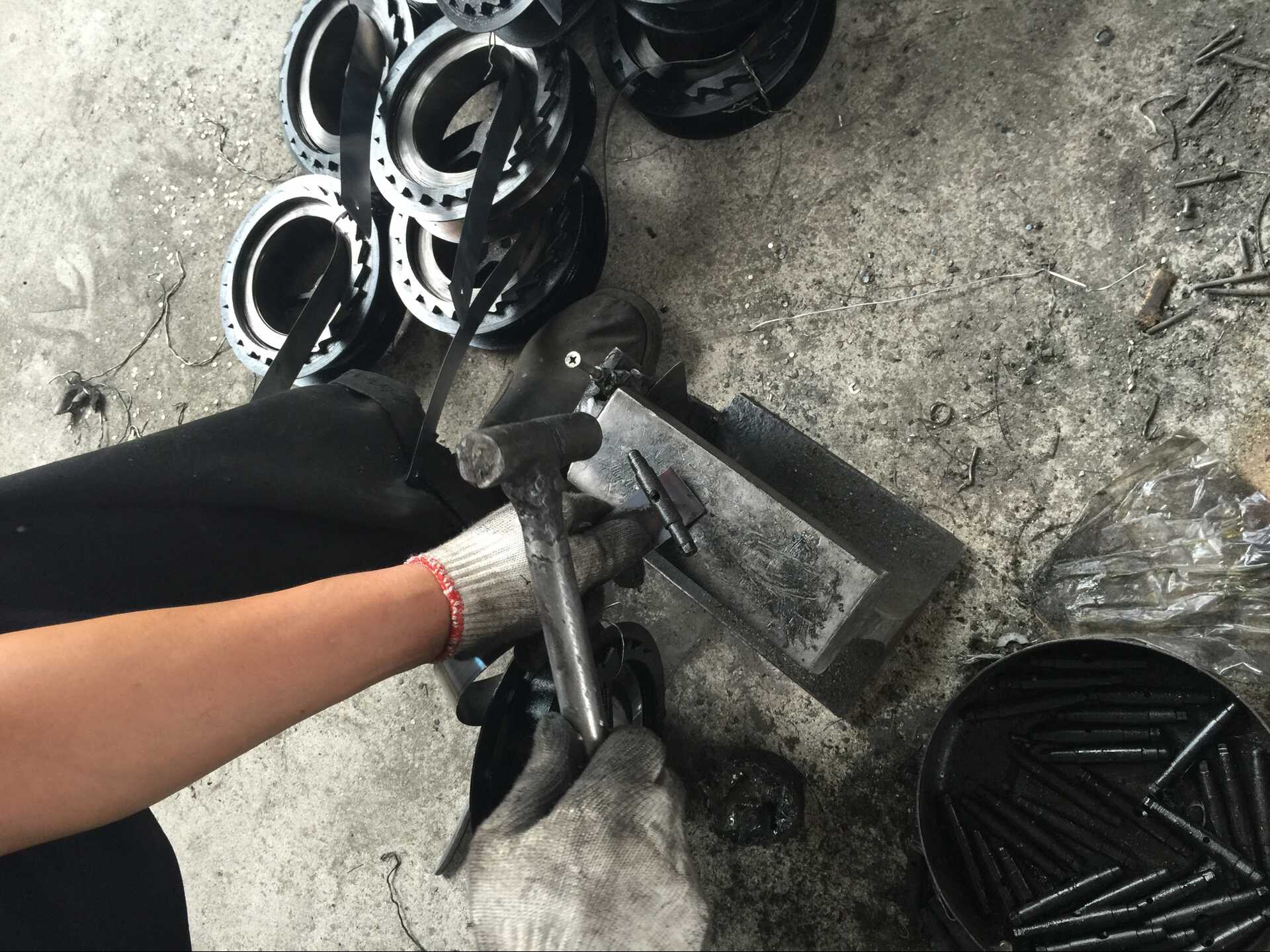 查看詳情防墜器卷鋼板的末端在固定這個(gè)止銷之前是經(jīng)過(guò)高溫?zé)频?,以方便?duì)鋼板進(jìn)行加工。止銷安裝在防墜器齒輪的中間孔內(nèi),主要起到固定卷尺鋼板的作用。此圖片展示的是將止銷先固定在鋼板彈簧上,師傅正在敲打螺絲釘將其固定在直銷中間的位置內(nèi),師傅左手握的那一截鋼板是經(jīng)過(guò)燒制以后的,所以質(zhì)地較軟,方便彎曲也方便用螺絲釘固