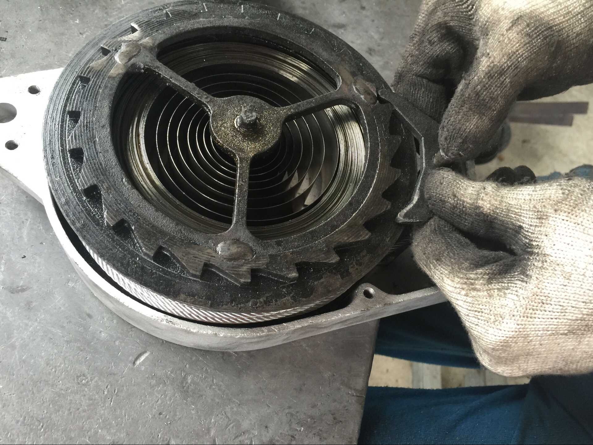查看詳情圖片展示的是將卷鋼板放進(jìn)防墜器內(nèi)部齒輪。這種卷鋼板所起到的作用相當(dāng)于我們的汽車剎車片。不同類型的防墜器內(nèi)部卷鋼板的米數(shù)存在不同差別,比如圖片展示的這種30米防墜器內(nèi)部所放置的卷鋼板長(zhǎng)度是不好控制的,只能依靠安裝在防墜器齒輪內(nèi)部以后,由卡尺來(lái)測(cè)量,單層卷鋼板厚度為1毫米。一般情況下,5米防墜器卷鋼板厚