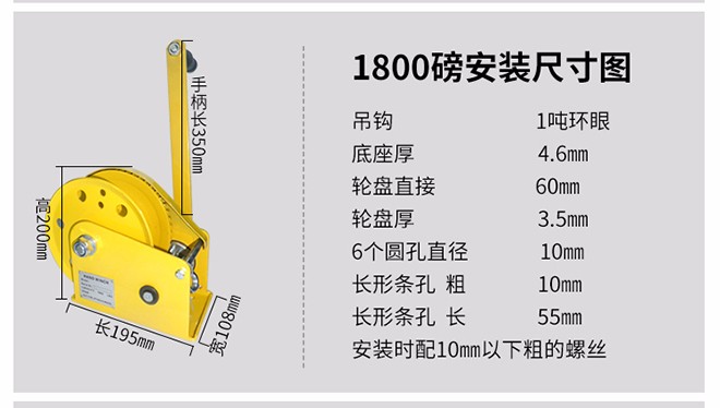 查看詳情咨詢電話:13933276606產品名稱:自鎖手動絞盤1800LBS;型號規(guī)格:本手動絞盤型號為自帶剎車式,根據拉力不同,可分為1200LBS、1800LBS和2600LBS等三種規(guī)格;其中,根據是否配置鋼絲繩及吊鉤又可分為裸機和全機兩種(裸機一種拉力對應一種裸機,全機規(guī)格如下文所述);1200LB